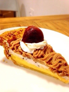 パイクラストにカスタードクリームをひいて、その上に自家製丹波栗の渋皮煮を細かく刻んで混ぜた生クリーム、そして洋栗を使用したモンブランクリームの三層のクリームにもちろん、細かく刻んだ栗だけでなく、大きな丹波栗の渋皮煮をドーンと乗っけて完成です♪濃厚でしっかりと栗を味わえるクリームとパイの塩気がとても合いますよ♪(^_^)