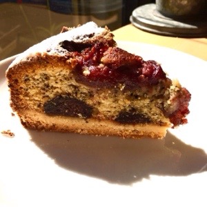 底にクッキー生地をひいて、その上に赤ワインに漬け込んだドライ黒イチジクを並べてアールグレイ生地を流し込み、赤ワインでコンポートしたイチジクを乗せて焼き上げました。