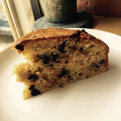オリーブオイルの香りがほんのりするケーキにローズマリーと、ビターチョコを混ぜて焼き上げました。