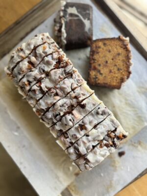 フルーツミンスチョコチップスパイスケーキ、サワークリームグレーズがけ、