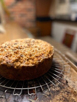 スペインのバスク地方で有名なイディアサバルチーズという羊の乳で作ったセミハードチーズを削り入れたバターケーキにピーカンナッツのローストを混ぜ込み丸型に流し込み、表面にはオートミールクランブルを散らして焼き上げました。