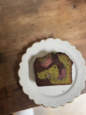 抹茶のバターケーキとココアのバターケーキに紫芋のオレンジ煮をゴロゴロ入れて焼き上げました。