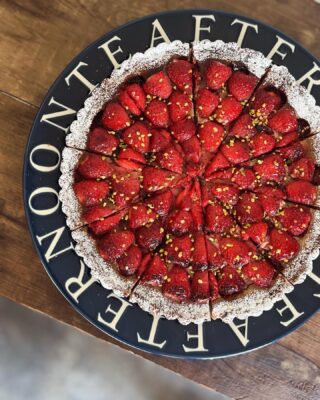 ピスタチオペーストを混ぜ込んだアーモンドクリームを流し込んだタルトに焼き上がりに、お砂糖でマリネしてオーブンで焼いた苺を焼いてる時に出てくる果汁ごとタルトに乗せて完成。