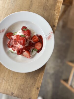 サクサクの桜メレンゲの上に桜の花の塩漬け、苺のソルベ、生クリーム、苺、ラズベリー、そしてベリーのソースをかけて。