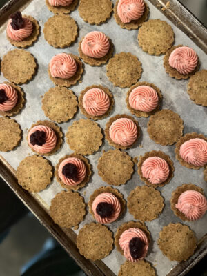 ザクザクガリガリした食感のオリーブオイルのクッキー生地に桜の葉を混ぜ込み焼き上げ、間には桜のバタークリームとティンムルペッパーを混ぜた粒あんをサンドしました。