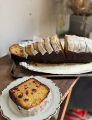 サワークリームを使用したリッチでしっとりとしたケーキに桜の葉と桜の花の塩漬けを細かく刻んで混ぜ込みグリオットチェリーを入れて焼き上げたケーキ。