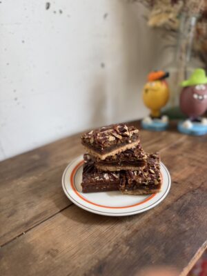 ピーカンナッツを混ぜ込んだショートブレッド生地をトレイに敷き詰めて焼き上げ、その上にモラセスシロップやゴールデンシロップなどと卵を合わせた卵液を流し込み、更に上にもたっぷりピーカンナッツを乗せて焼き上げたトレイベイクです。