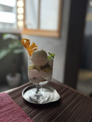 お菓子は引き続きパイナップルとキウイを使って、伊勢のいろいろを盛りだくさんにあわせたパフェ