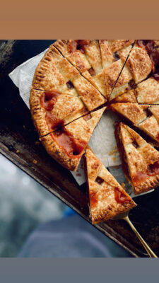 長野より送っていただいたアプリコットをシナモンやナツメグなどのスパイスとリキュールでマリネして、たっぷりパイクラストに詰め込んで焼き上げたダブルクラストのフルーツパイ。