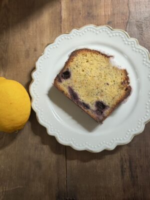 淡路島レモンコンポートを刻んで混ぜたレモンケーキに、ブルーベリーとドライブルーベリー、ポピーシードを混ぜて焼き上げました。