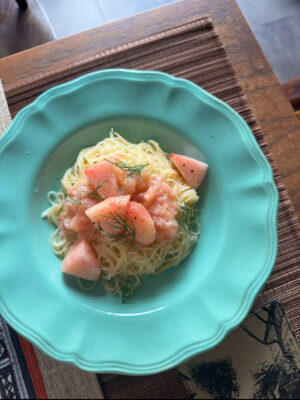 ⬆️syukaで今週出している桃の冷製パスタと、ベトナムで買ってきた薄〜いライスペーパーの生春巻きです♪