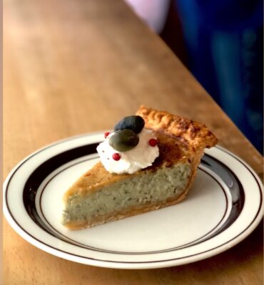 篠山の名産黒枝豆を湯がいて実だけ取り出しピュレにして、パンプキンパイと同じように卵液と合わせてパイクラストに流し込みプリンのように焼き上げました。枝豆の甘みに塩気を効かせて、枝豆の甘みを引き立てています。ずんだシェイク好きの方に是非食べていただきたいパイです。