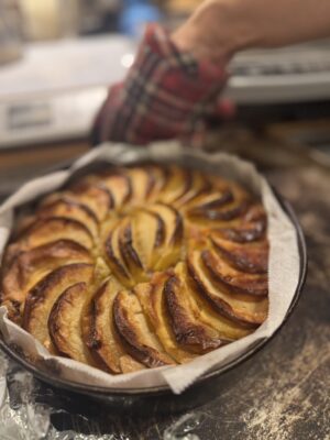 パイクラストにスパイスなどでマリネしたリンゴをたっぷり詰め込み、そこに自家製の塩キャラメルクリームを上からかけて、その上にパイで格子状に覆って焼き上げました。