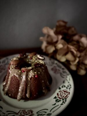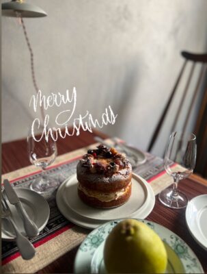 クリスマスなのでトップに粉糖だけでなく、バタークリームとナッツやスターアニス、ザクロ、ハーブなどで飾り付けを施しました。