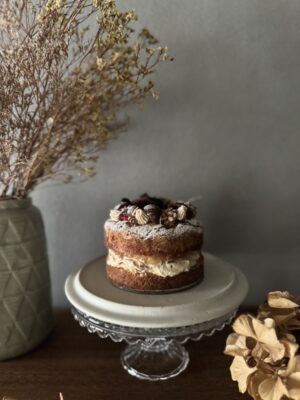 スパイスの効いたむっちりホロホロとした食感の、ナッツやレーズンやにんじんなどの具沢山なケーキにクリームチーズフロスティングを乗せたケーキ。
