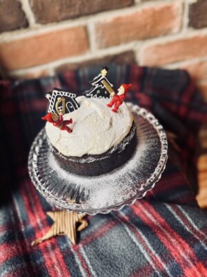 このクリームチーズフロスティングを雪原に見立てて素朴な落書き風のお家とツリーのアイシングクッキー、そしてボニーズのクリスマスケーキと言えばの森の小人を飾りました♪