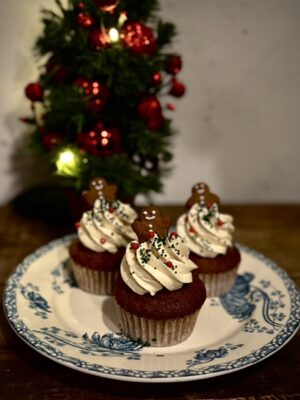カップケーキは、バターミルクを使用したケーキ生地にメープルに合うスパイスを数種類ブレンドして混ぜ込み焼き上げ、その上にメープルウイスキーバタークリームを絞ってスプリンクルやジンジャーマンクッキーで可愛くデコレーションしました。