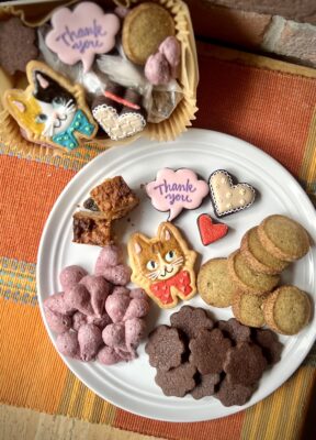 今年はトルコで沢山の猫と触れ合ってきたので、それの影響を受けて猫とハートと吹き出しでthank youのアイシングクッキー、そしてしたのクッキーは塩チョコサブレ、ピーナッツバターチョコチップレーズングラノーラバー、ザクロティーのハートのメレンゲ、紅茶のディアマン、のセットです。